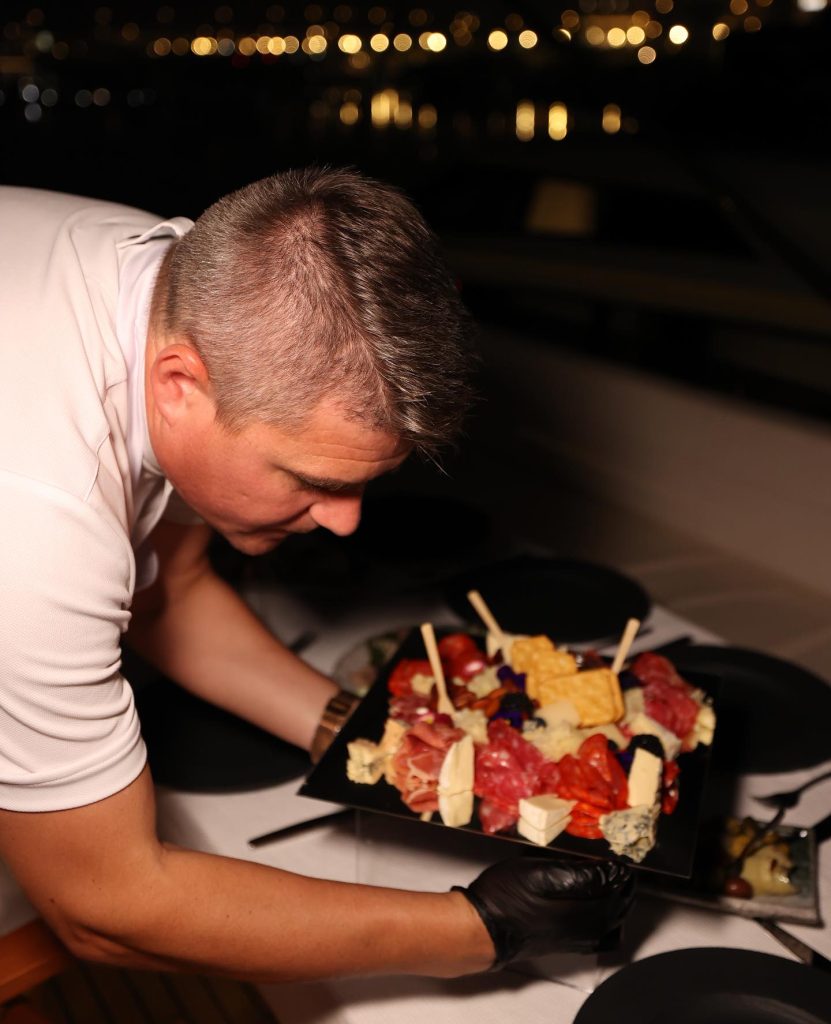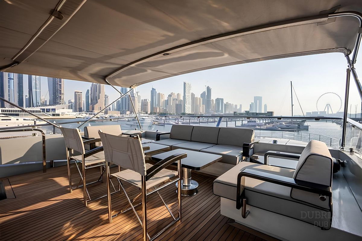 Whether cruising past Palm Jumeirah or anchoring for a calm swim stop, the yacht’s open design creates a seamless connection between sea, sky, and onboard living.