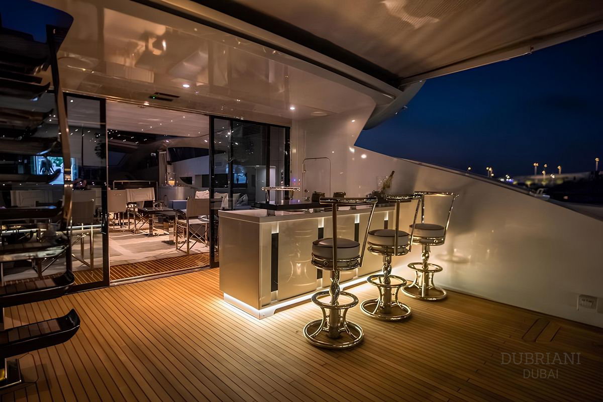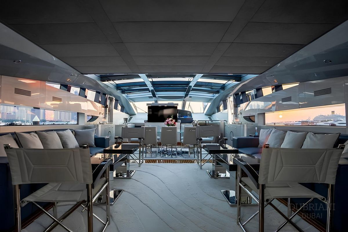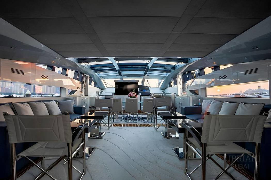 One of the defining features of the Baglietto 110 is her extraordinary open deck layout. Generous exterior areas invite guests to relax, socialize, and take in Dubai’s skyline from multiple vantage points.