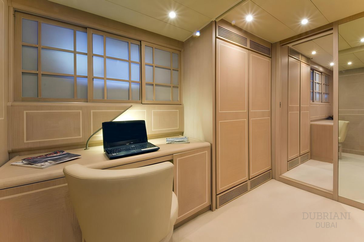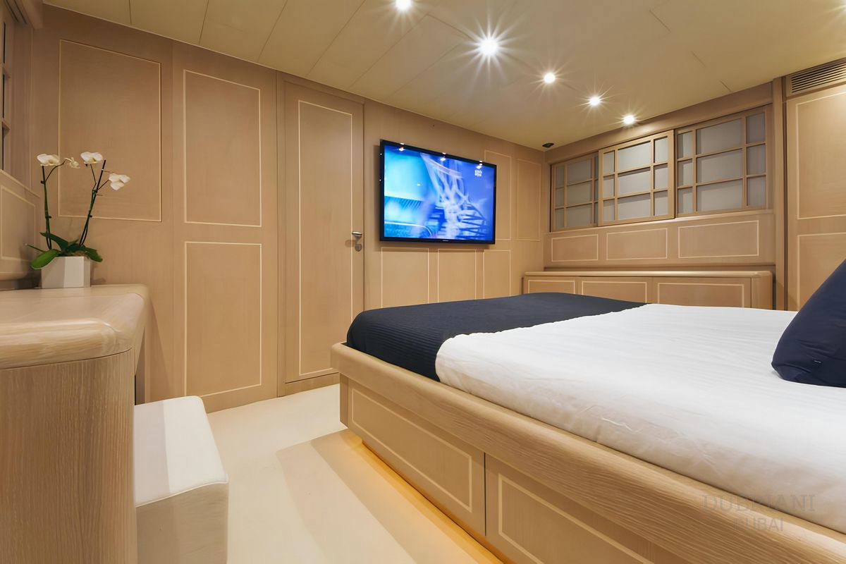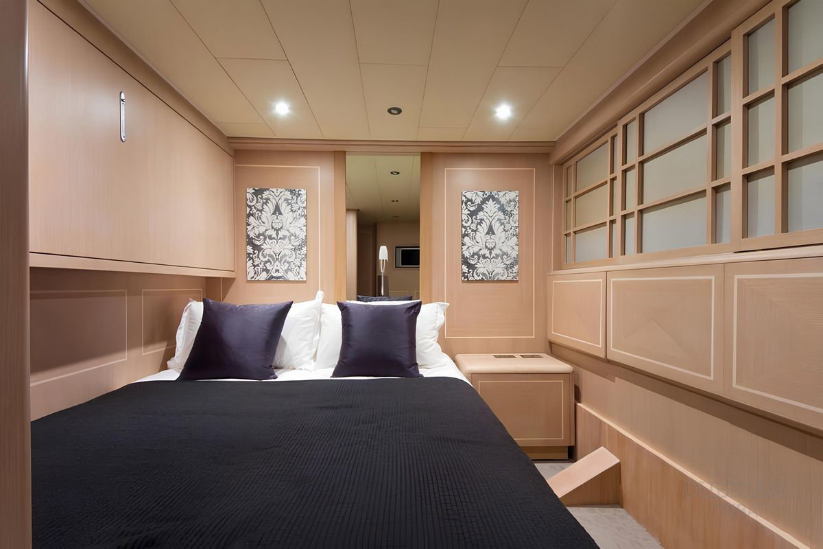 Below deck, the Baglietto 110 offers three beautifully finished cabins, accommodating up to 6 overnight guests.