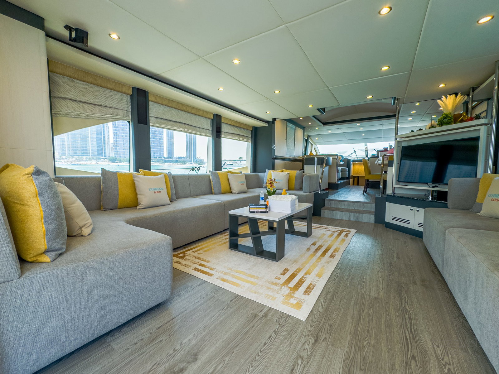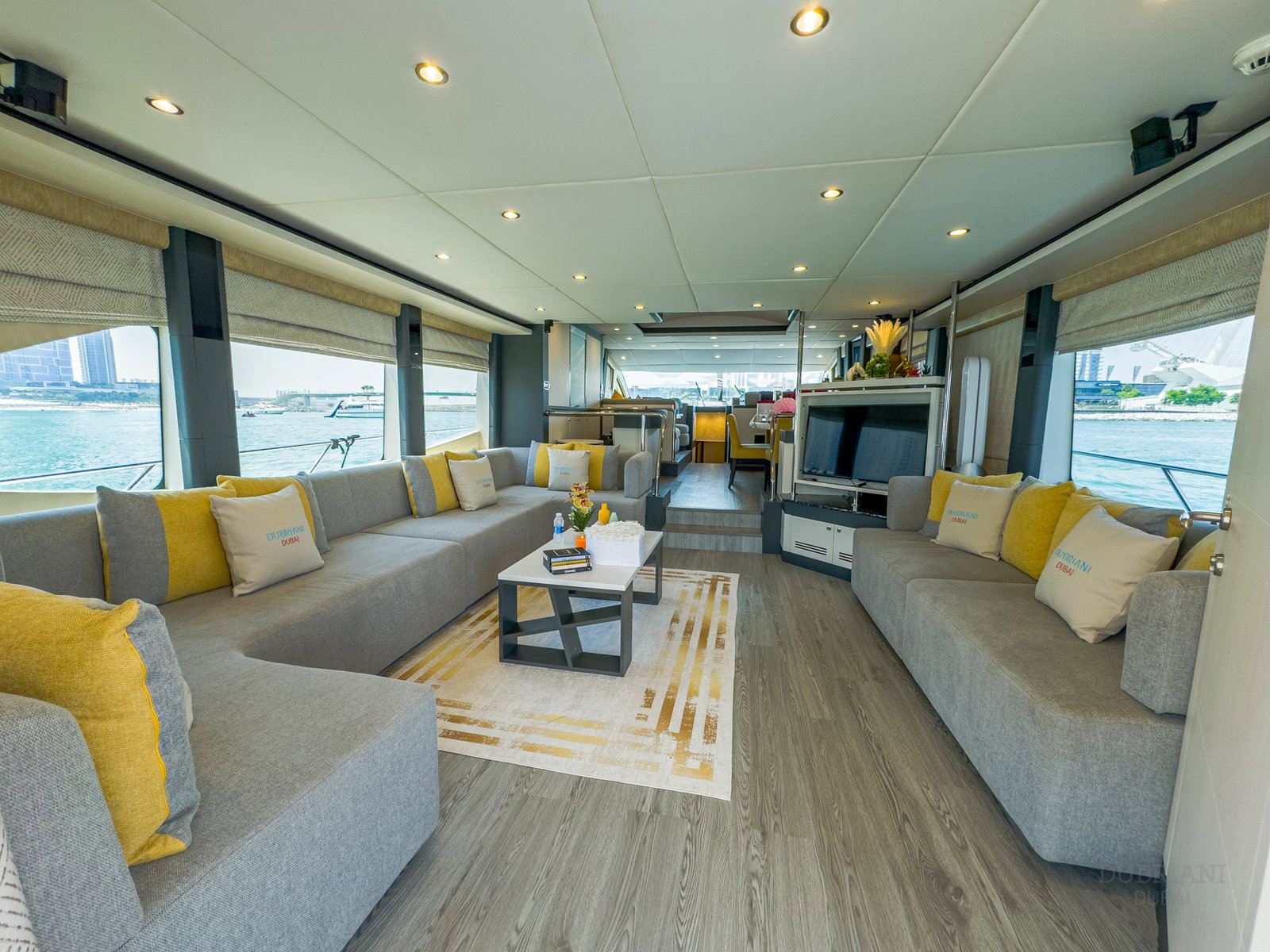 Inside, Cabo 77 features a large, open saloon with stylish sofas that give the space a fresh, modern look. The interior feels bright and inviting — perfect for sitting together, enjoying drinks, or taking a break from the sun.