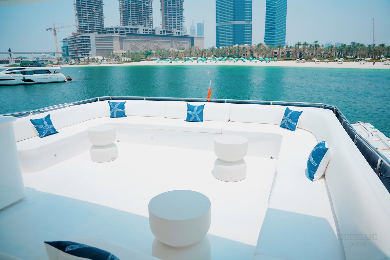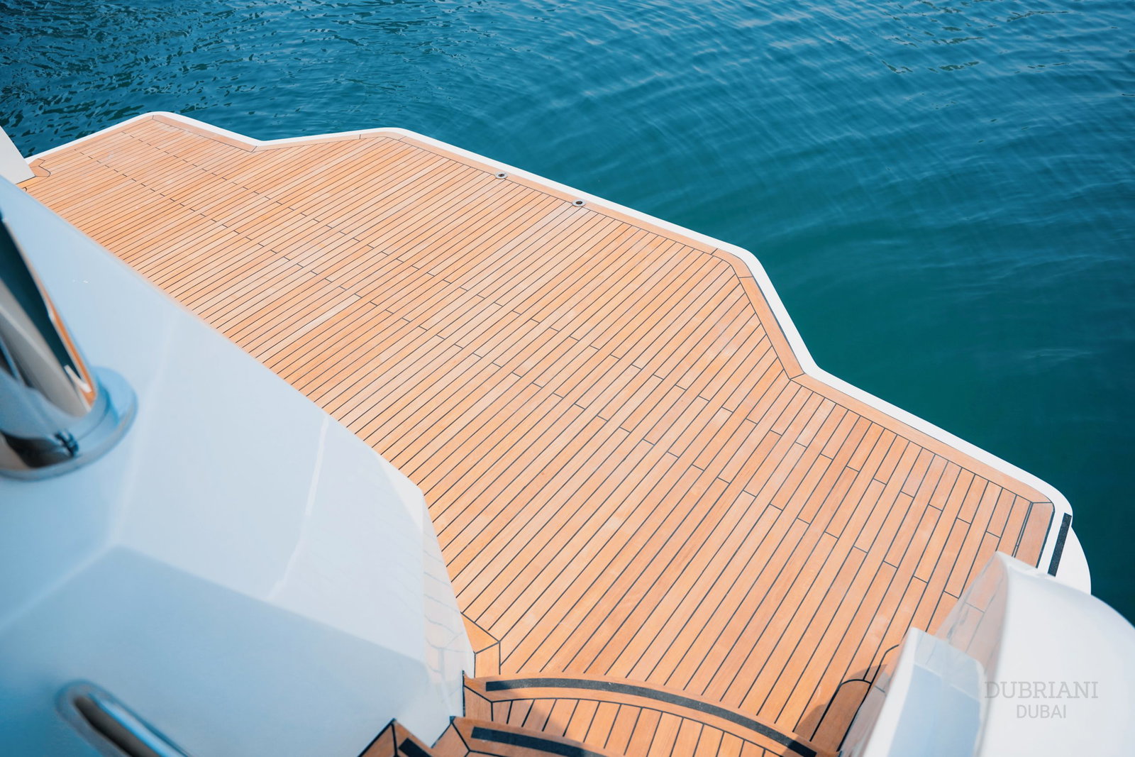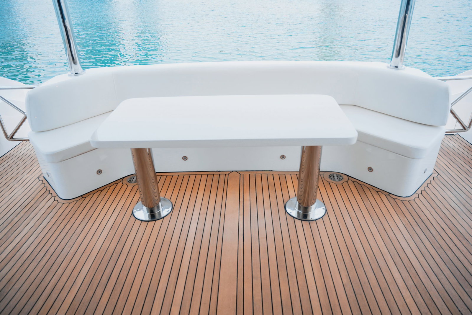 • The aft deck serves as the central gathering space — ideal for drinks, conversation, and uninterrupted marina views