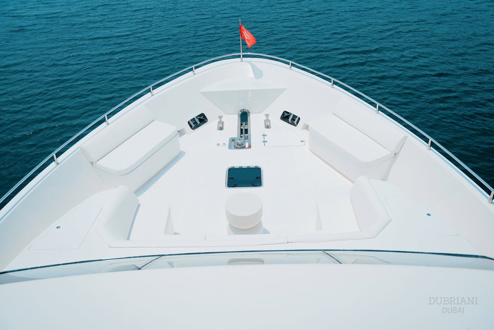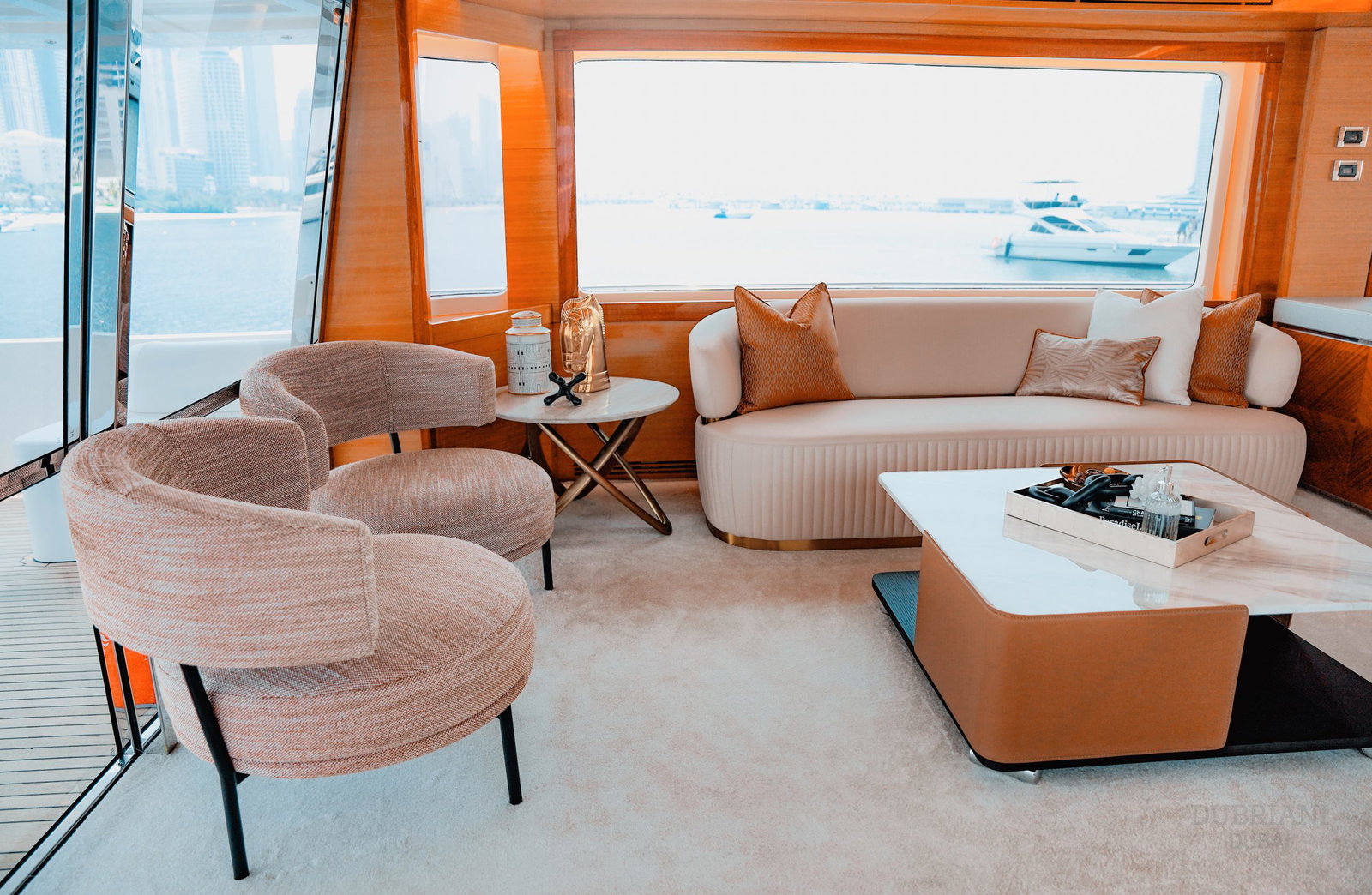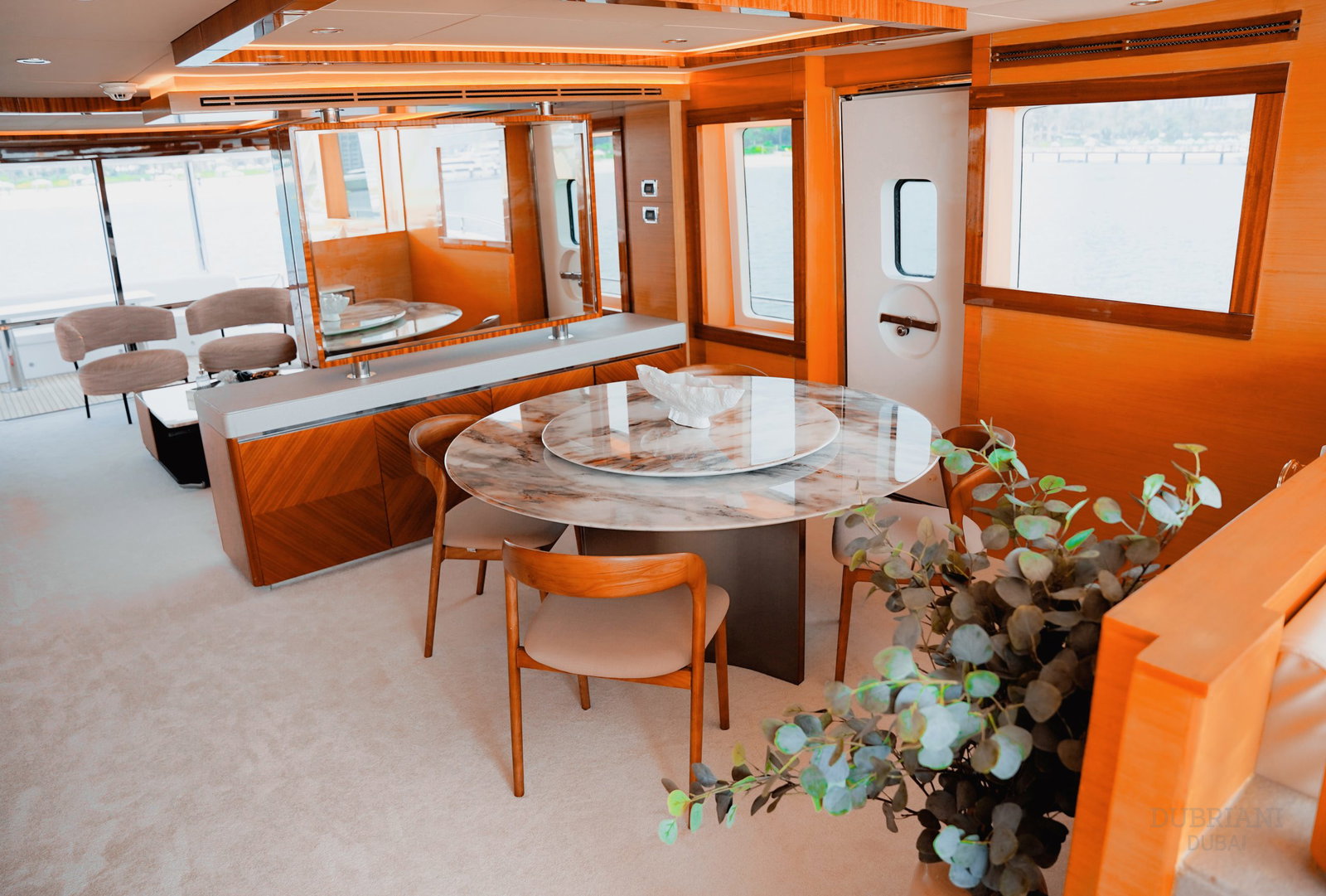 • The aft deck serves as the central gathering space — ideal for drinks, conversation, and uninterrupted marina views