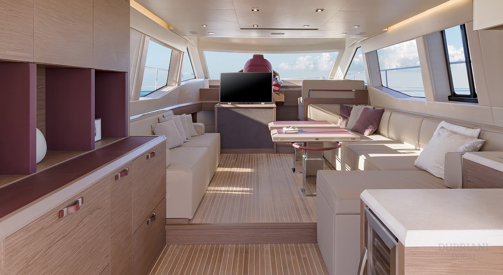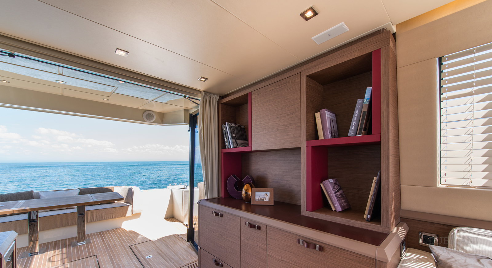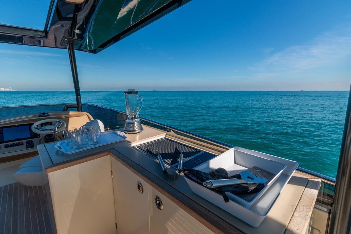 Inside, Monte Carlo 60 features a bright, modern interior with warm materials and soft finishes. Large windows fill the salon with natural light, creating an inviting environment for conversation, dining, or quiet moments away from the sun.