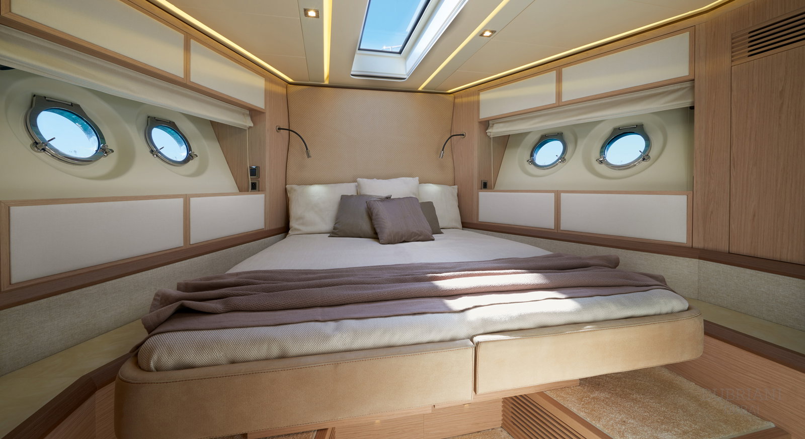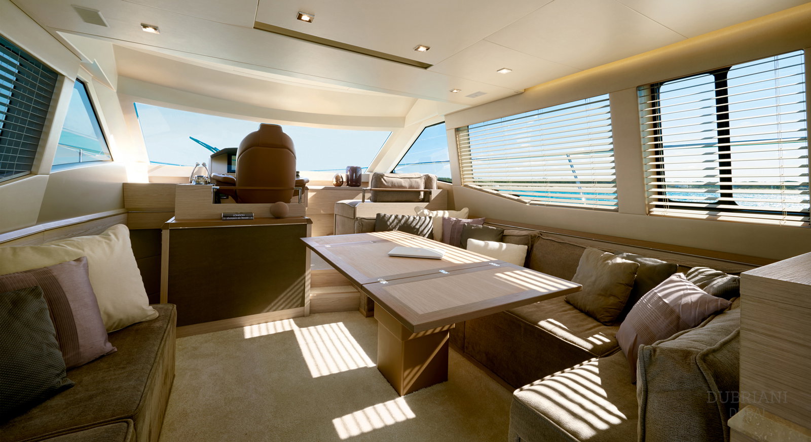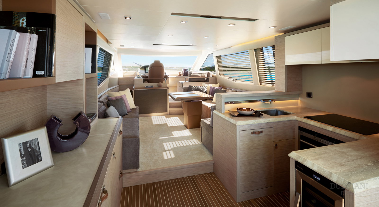Inside, Monte Carlo 60 features a bright, modern interior with warm materials and soft finishes. Large windows fill the salon with natural light, creating an inviting environment for conversation, dining, or quiet moments away from the sun.
