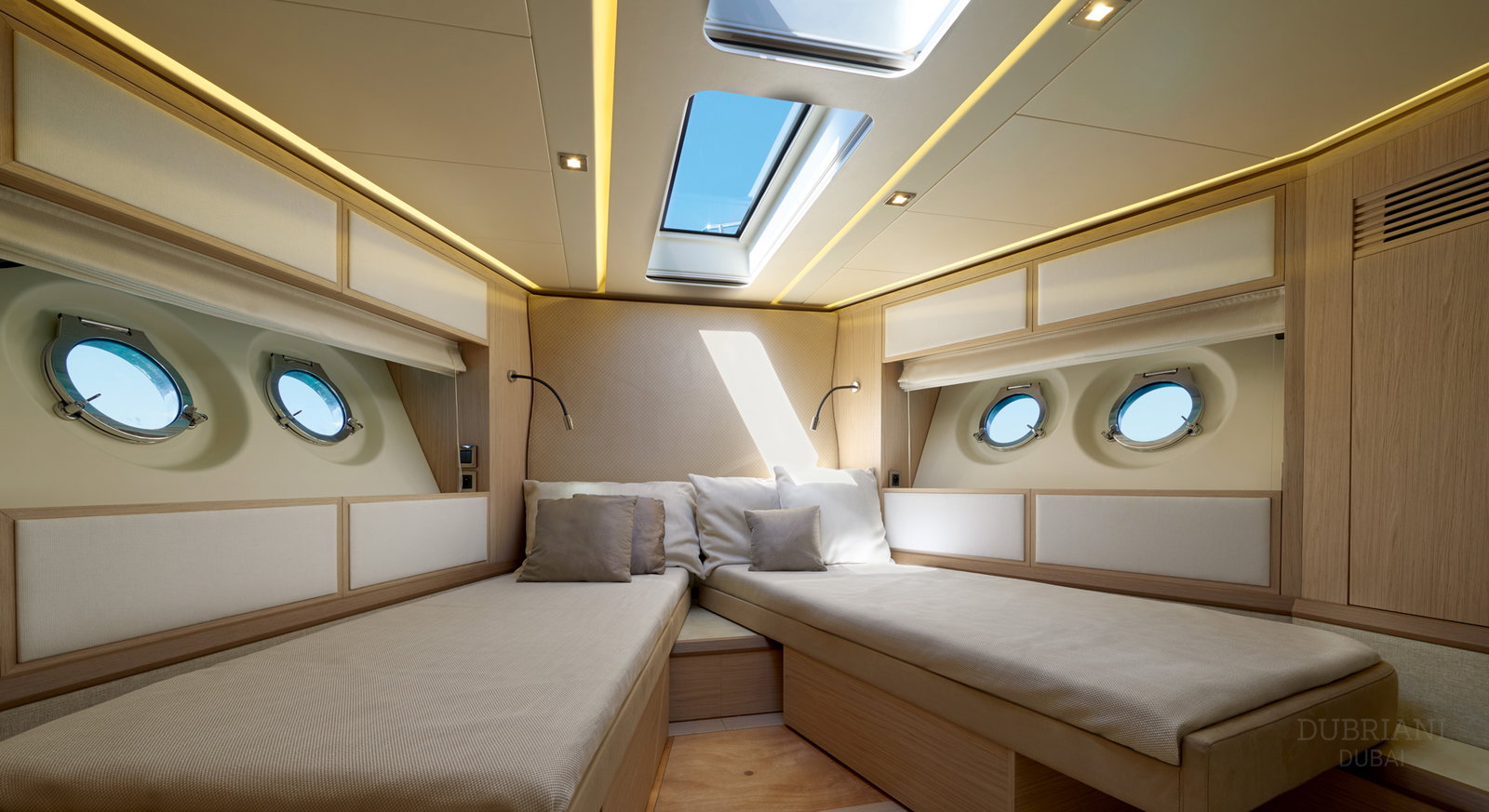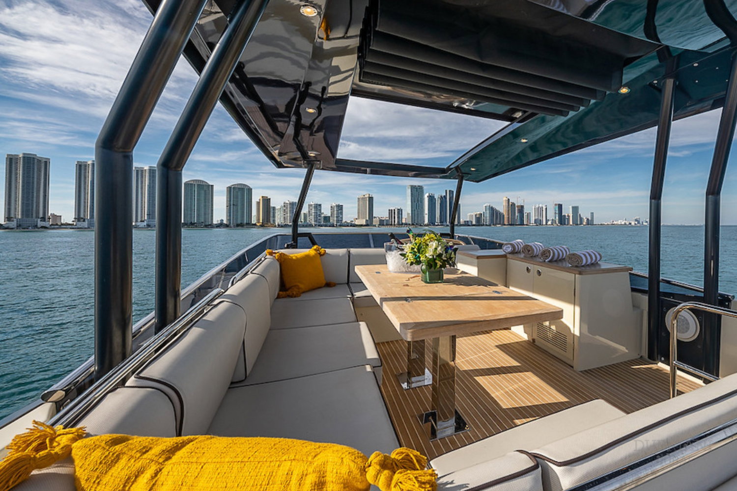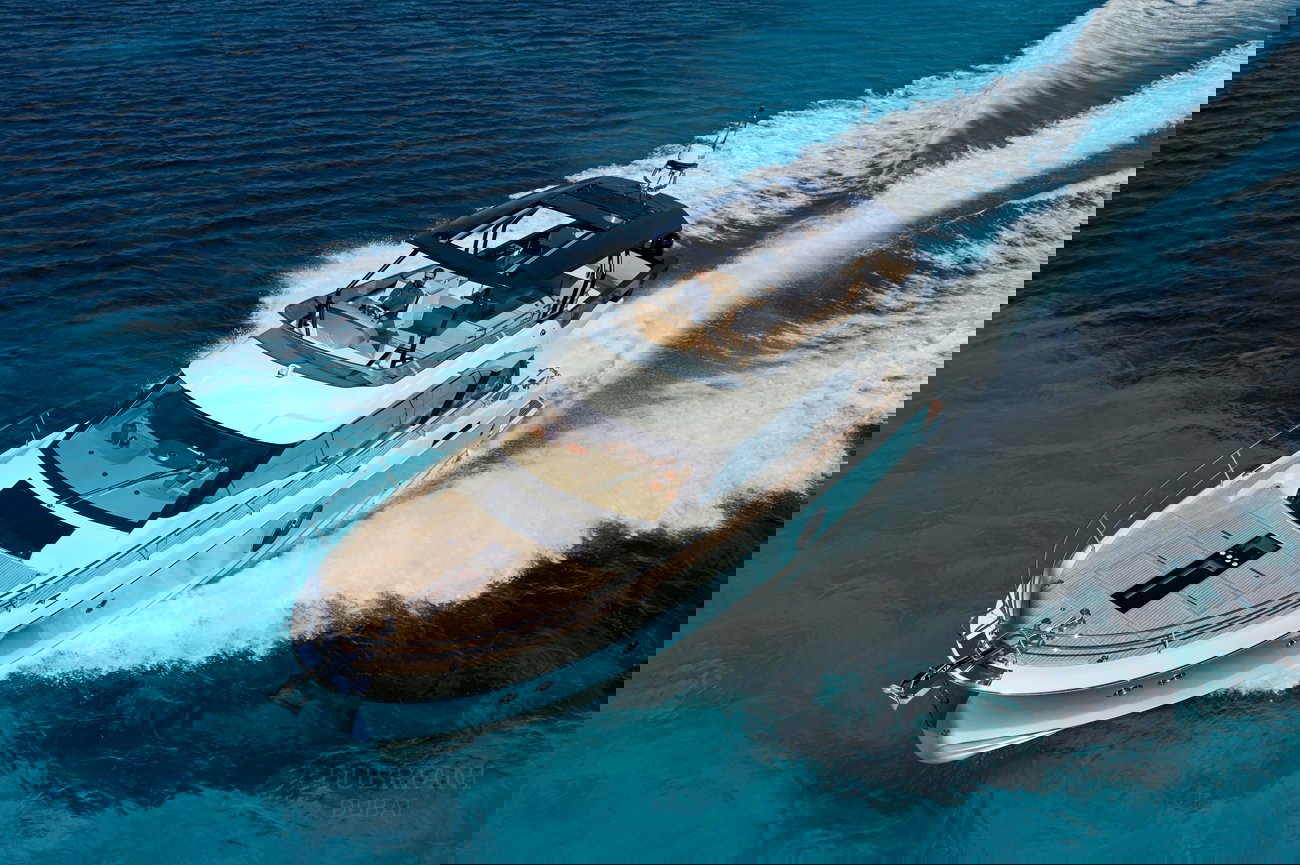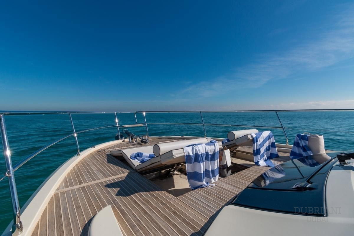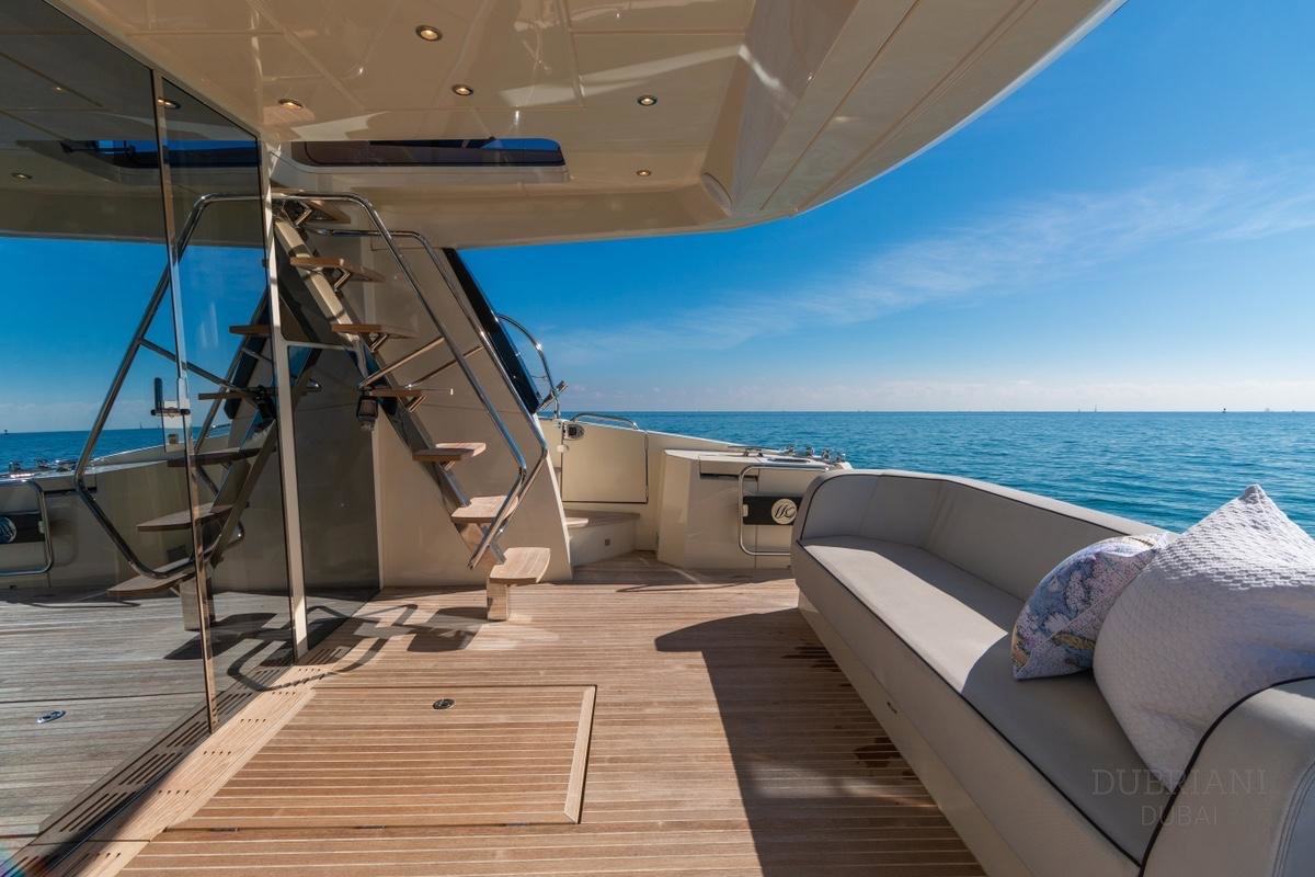 The aft deck and sun areas provide comfortable seating for enjoying Dubai’s skyline and coastline. Whether cruising past the Palm Jumeirah or anchoring for a swim, the yacht offers a relaxed setting where guests can unwind and enjoy the journey.