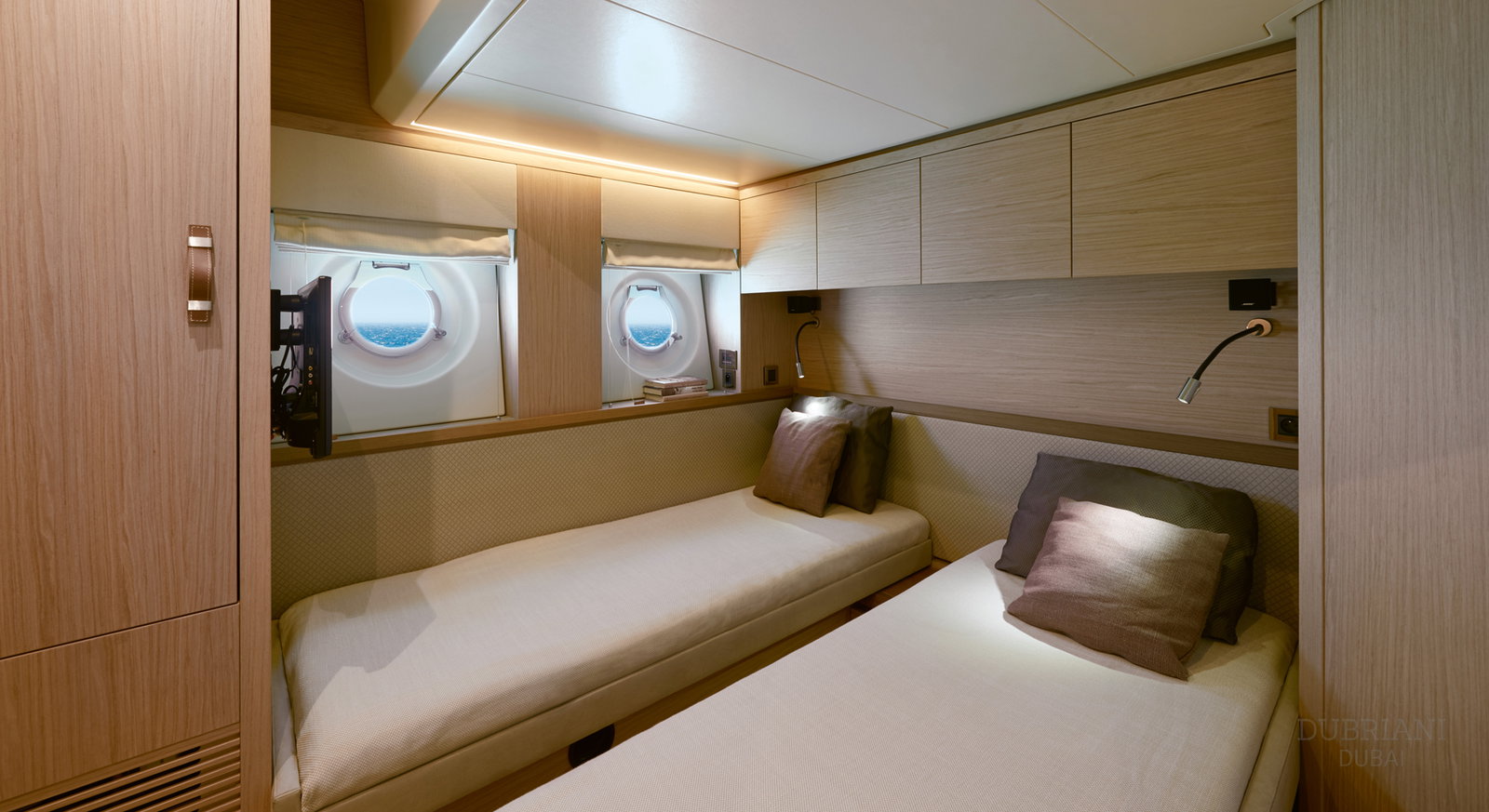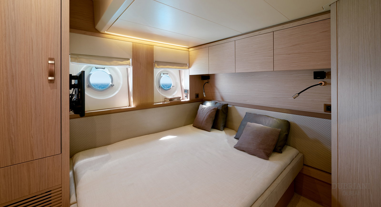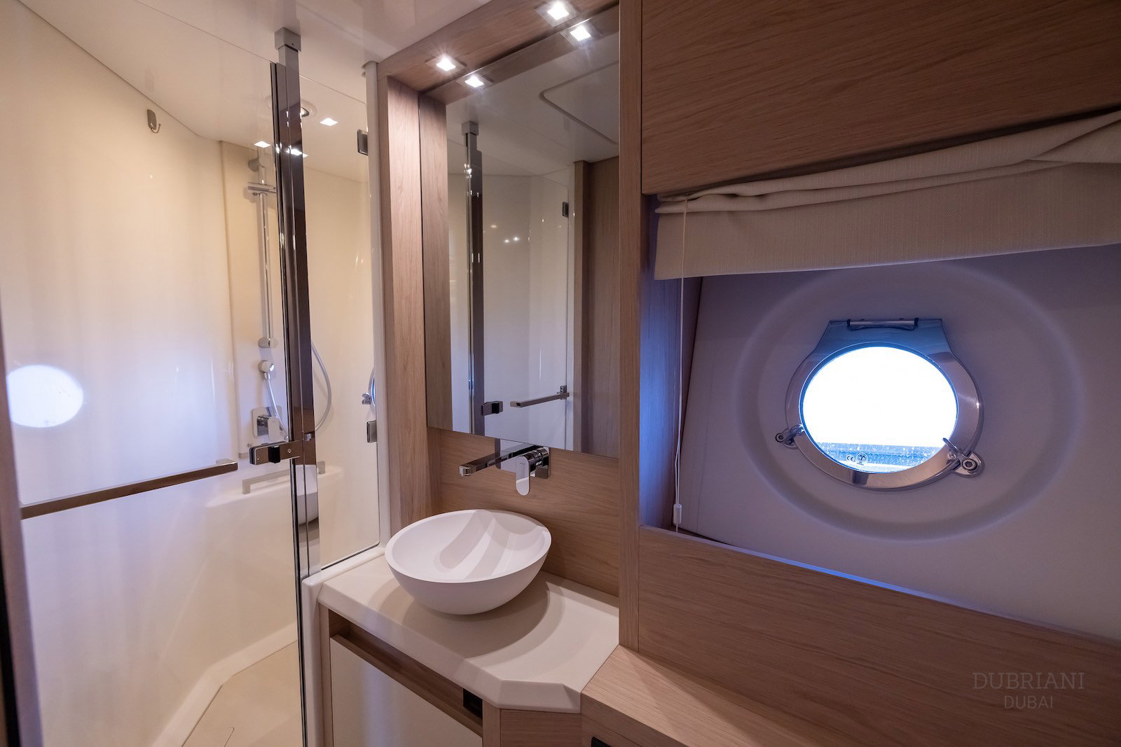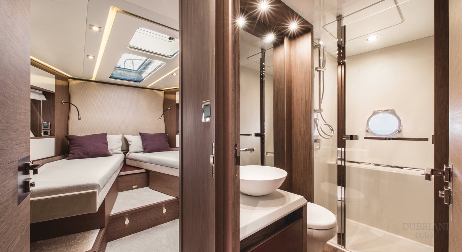 The aft deck and sun areas provide comfortable seating for enjoying Dubai’s skyline and coastline. Whether cruising past the Palm Jumeirah or anchoring for a swim, the yacht offers a relaxed setting where guests can unwind and enjoy the journey.