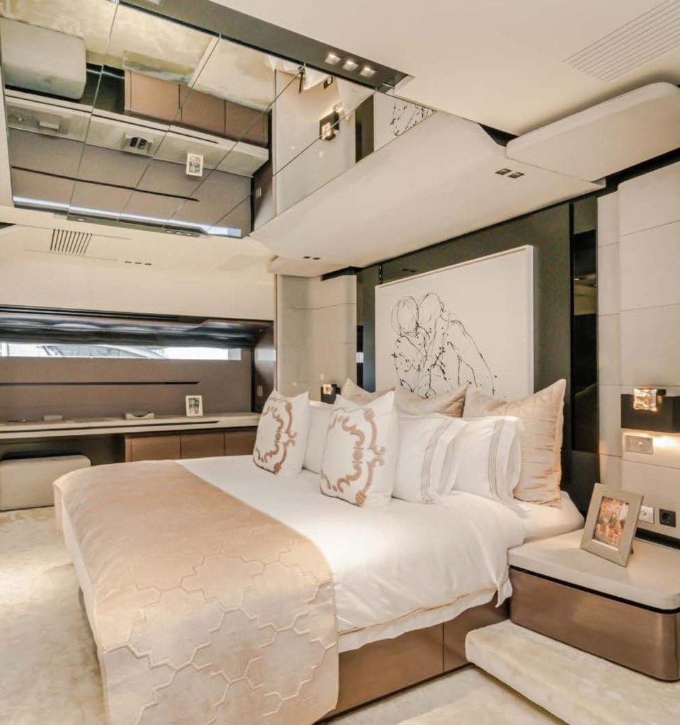The crown jewel is her full-beam master suite on the main deck, featuring: