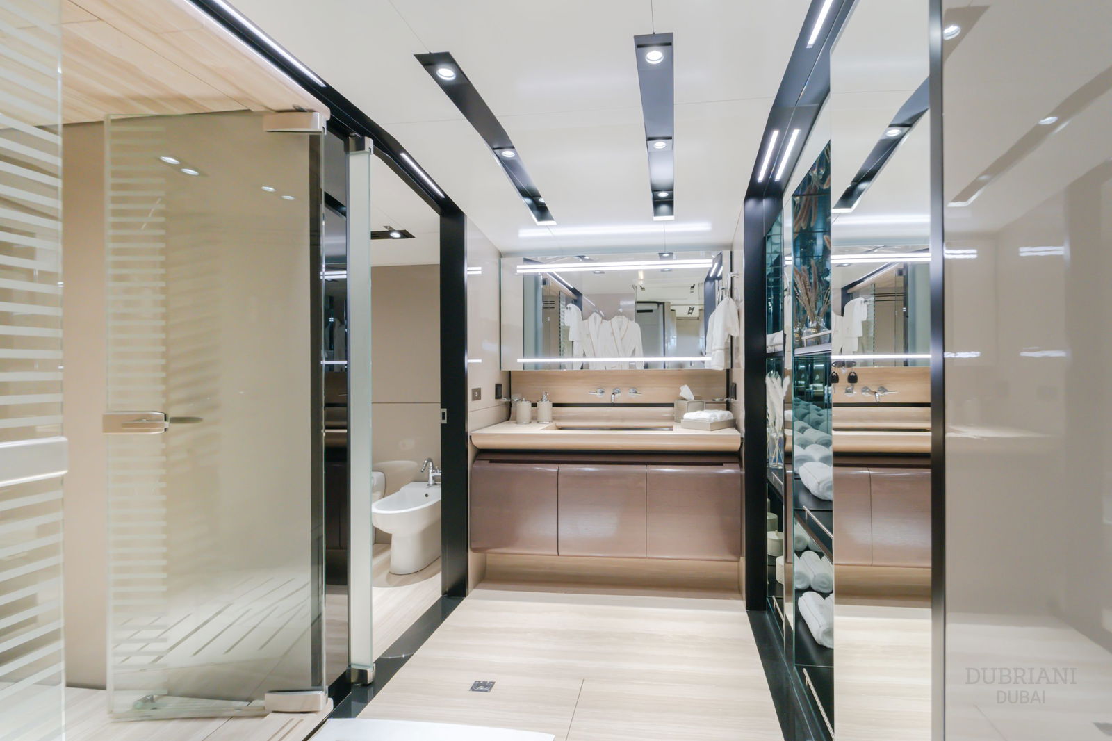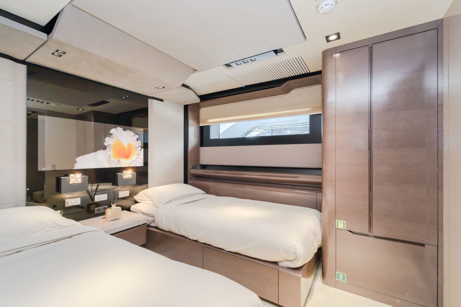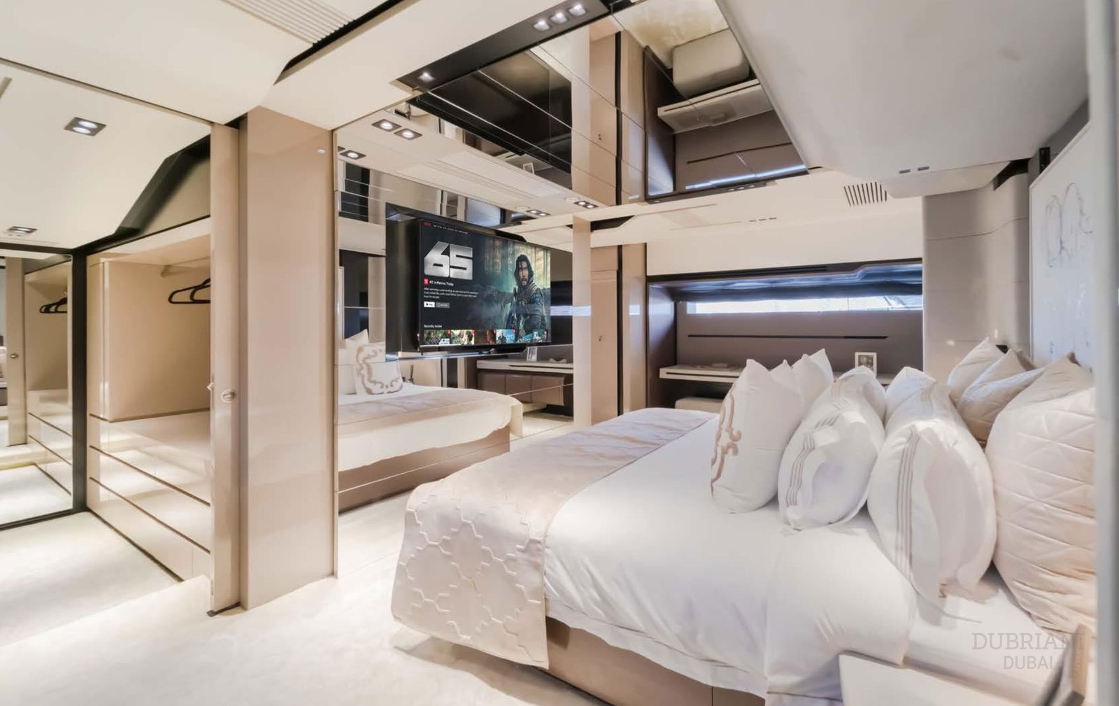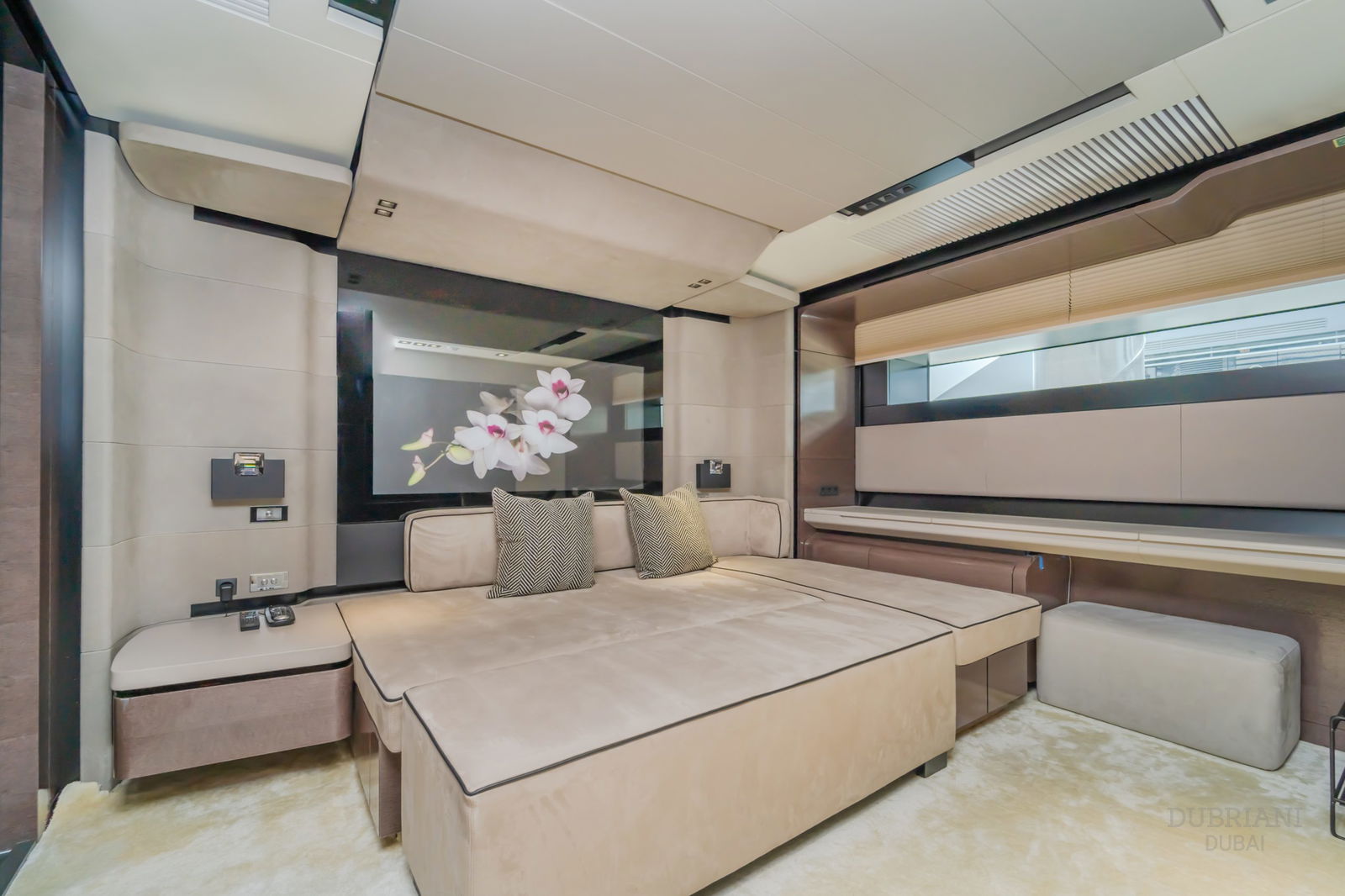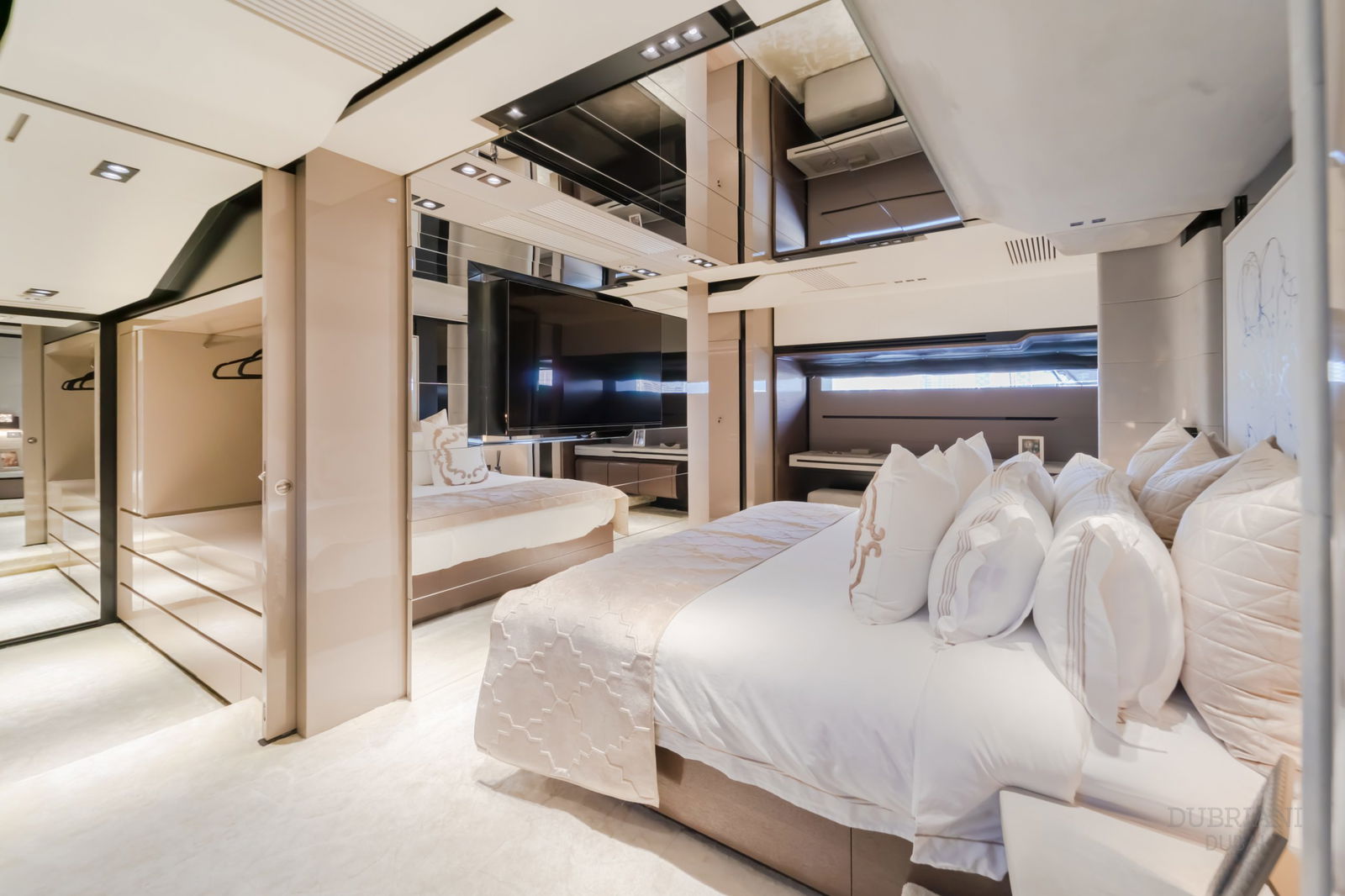 The crown jewel is her full-beam master suite on the main deck, featuring: