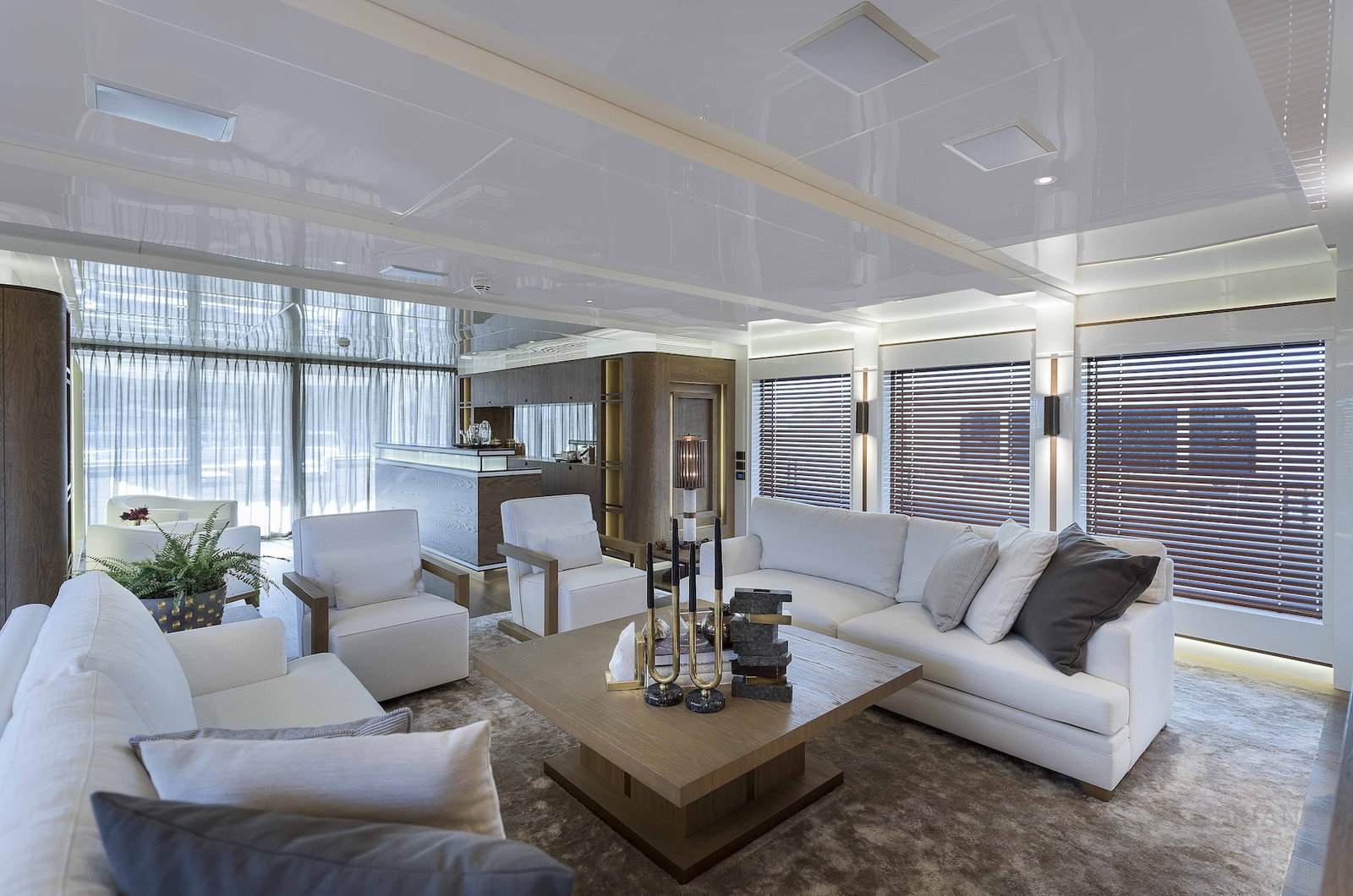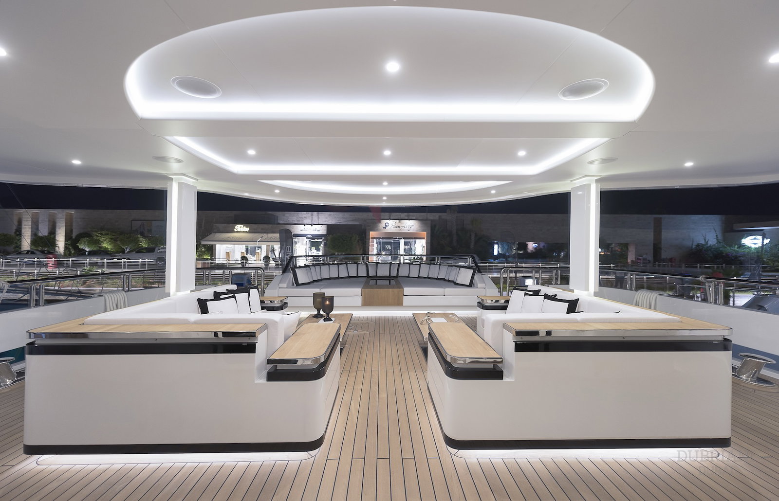 One of Skyfall 177’s defining features is her vast sundeck — an elevated sanctuary designed for social energy and relaxed indulgence. This open space includes a Jacuzzi, swim-up bar, and cascading waterfall feature, creating a setting that feels closer to a private beach club than a traditional yacht.