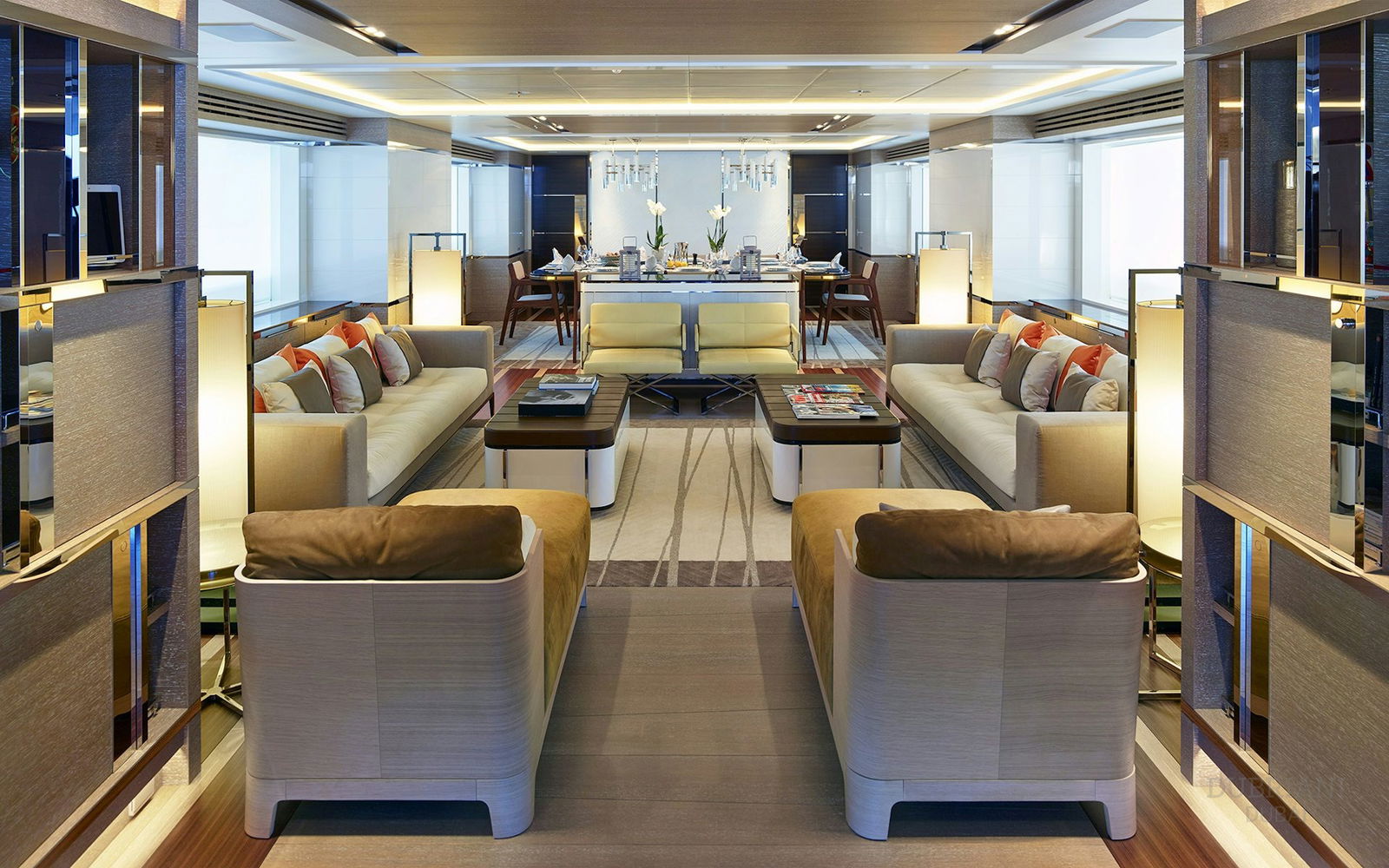 Natural light during the day transitions into ambient evening lighting, allowing the yacht to adapt from daytime cruising to night-time hosting effortlessly.