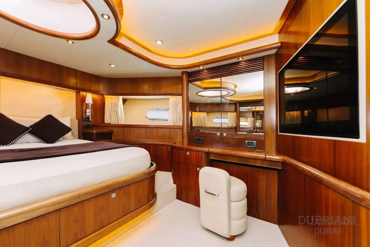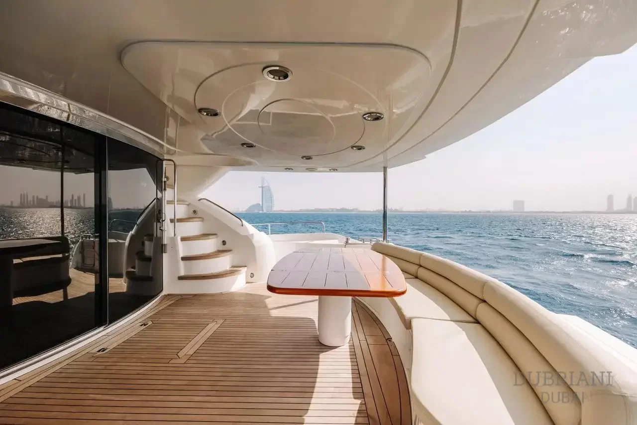 Confident, composed, and effortlessly elegant, the Sunseeker 88 is designed for guests who want space, presence, and a smooth experience on Dubai’s waters. At just under 27 metres, she offers the ideal balance between performance and comfort — large enough to host impressive gatherings, yet refined enough to feel relaxed and personal.