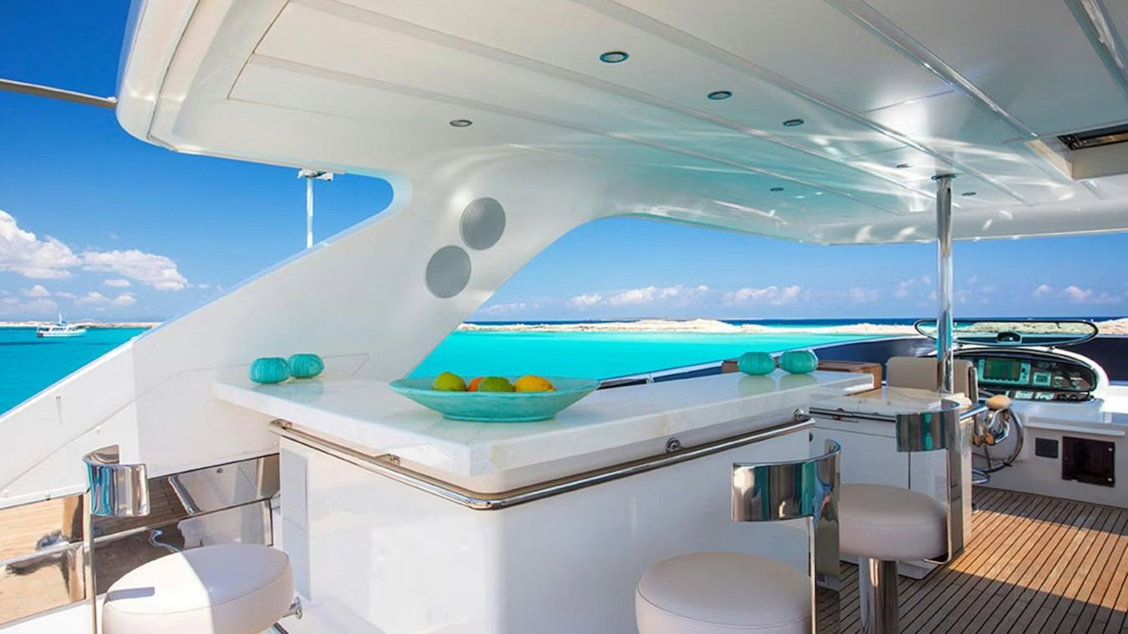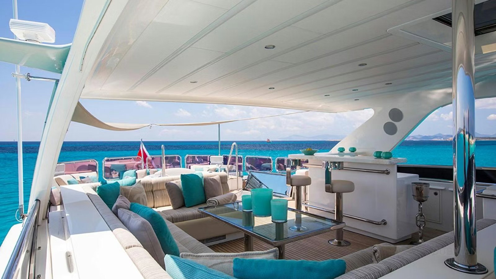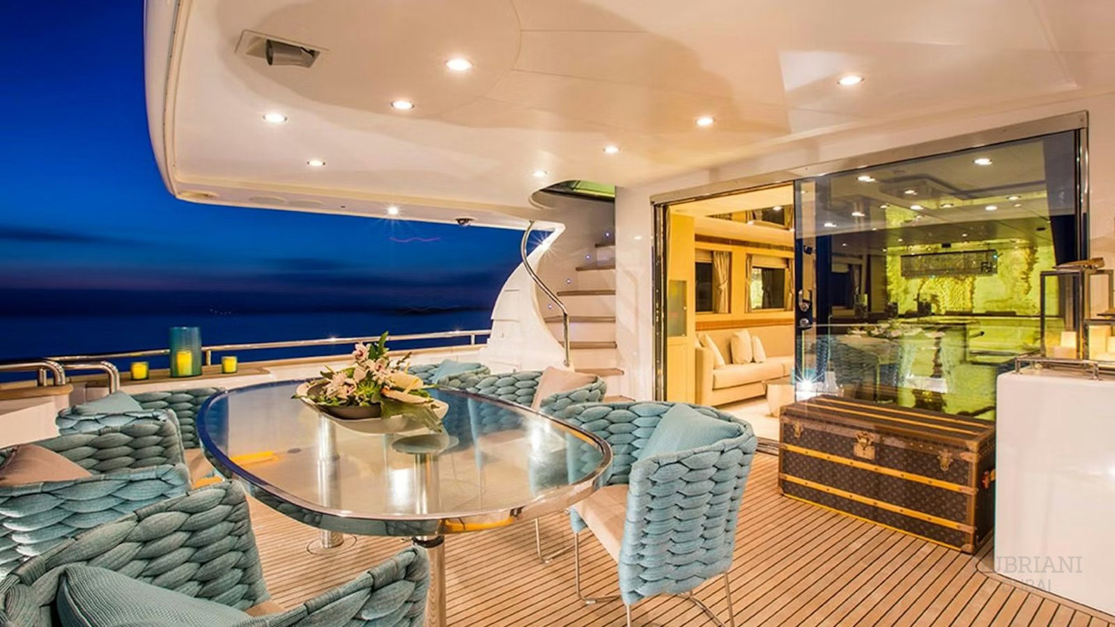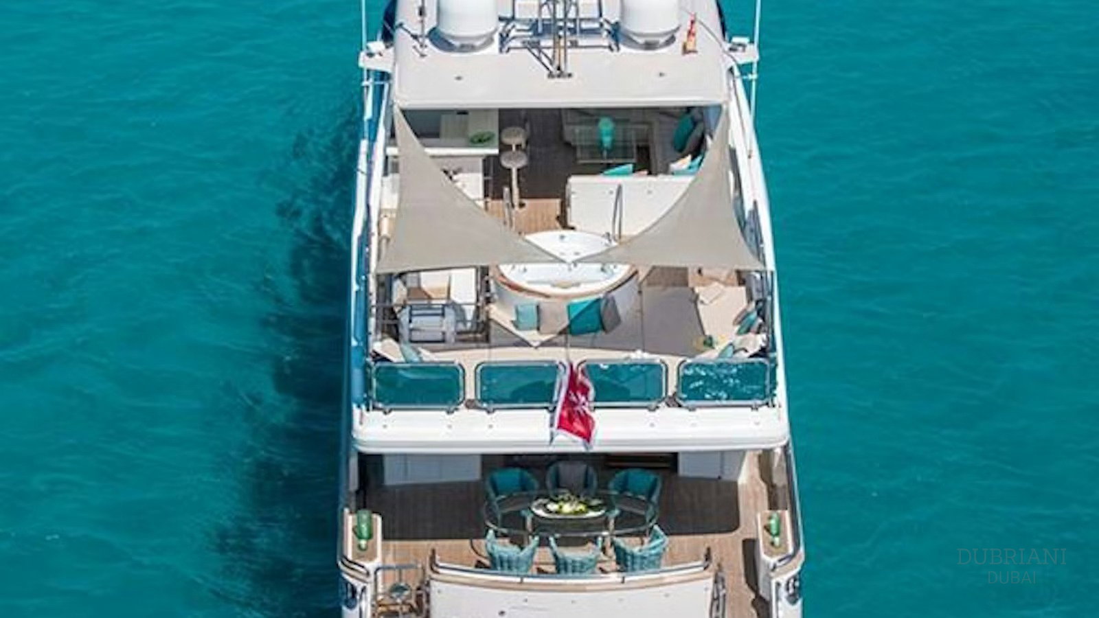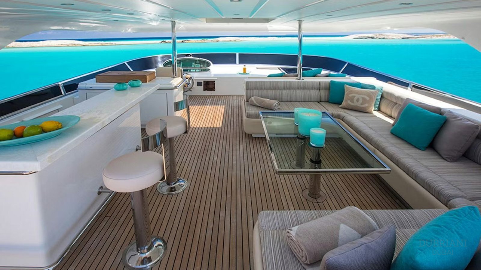 The upper deck provides wide, unobstructed views across Dubai’s coastline. The aft section supports seated arrangements or relaxed standing receptions, depending on how the charter is structured.