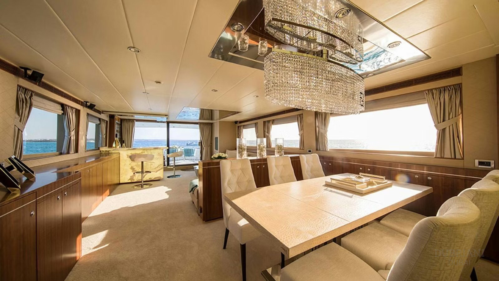Large windows introduce natural light during the day. In the evening, soft ambient lighting allows the yacht to transition into a composed hosting setting.